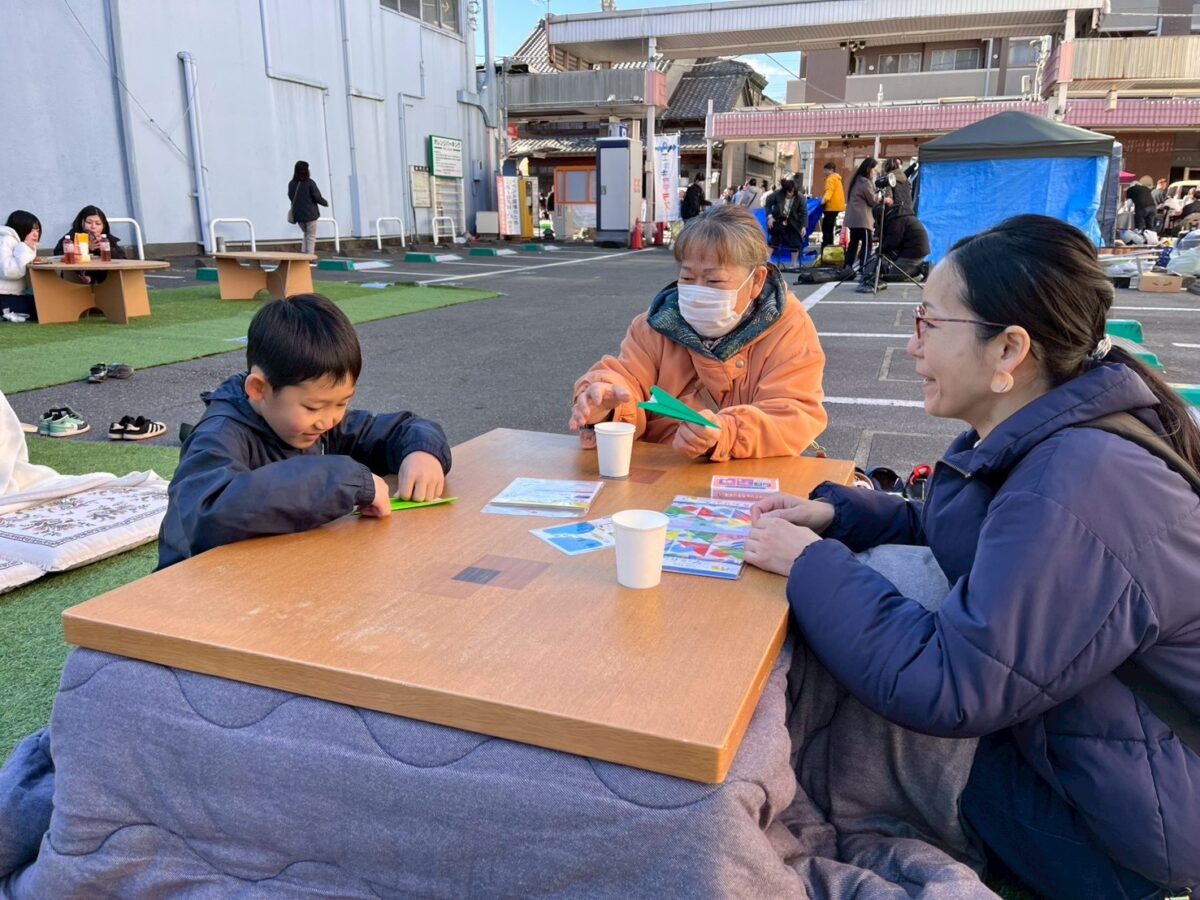 エキキタテラスの代名詞ともいえる人工芝のくつろぎスペースには、こたつや座布団を設置。買い物に来たお客さんがちょっと一息つける場所を作ることで、いつもよりも長時間、イベントを楽しんでもらう作戦です!