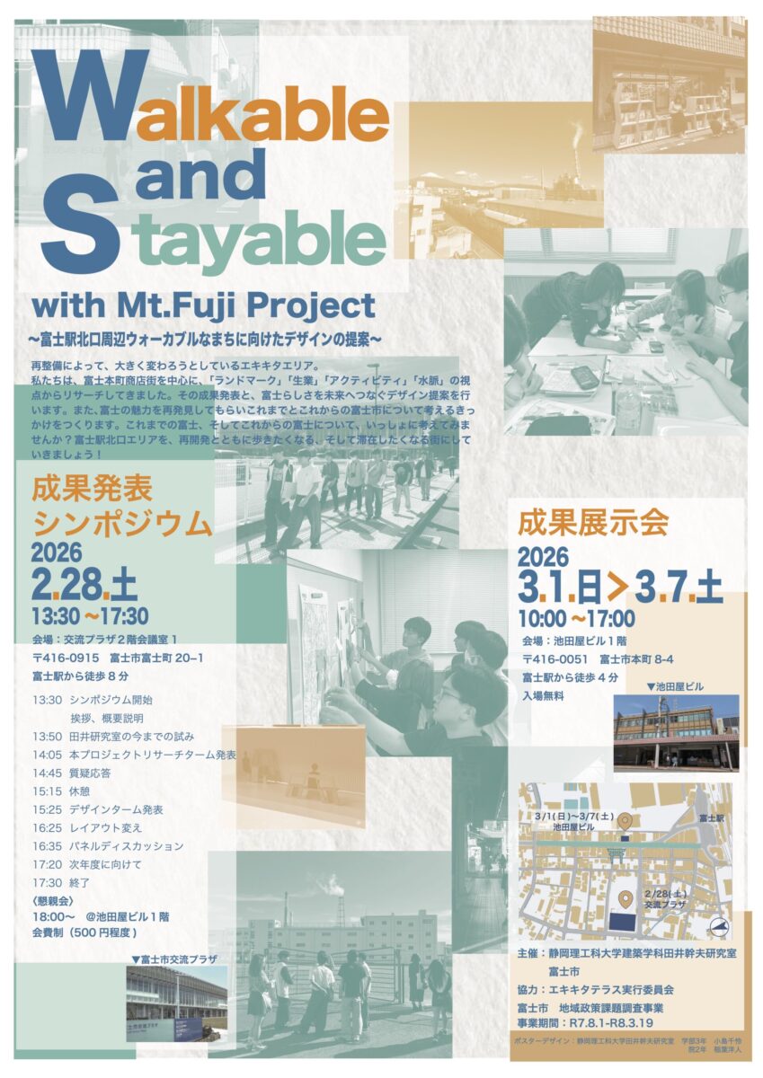 静岡理工科大学建築学科 田井幹夫研究室では、富士駅北口周辺エリアのウォーカブルなまちづくりに向けたデザインを検討するため、2025年夏からフィールドワークを実施しています。